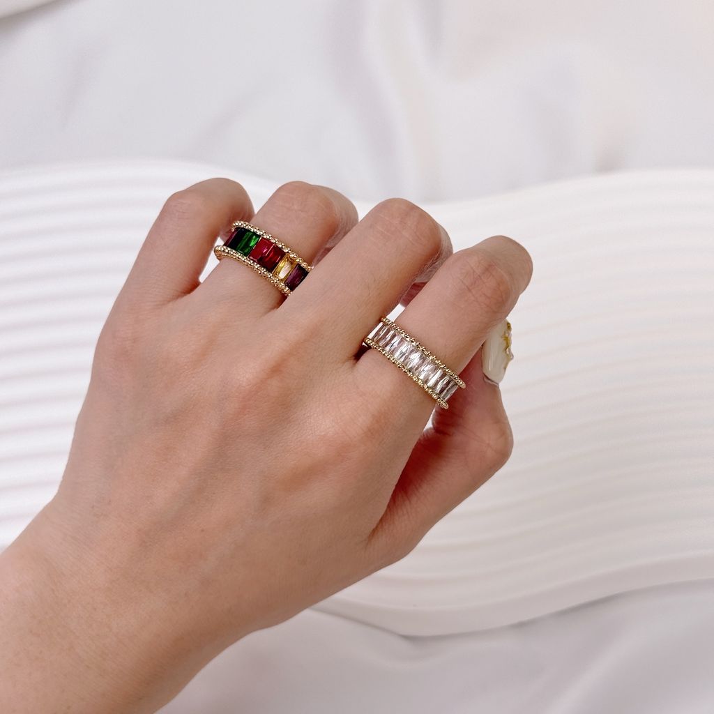 Framed in delicate gold beading, each baguette diamond catches and reflects light with crisp brilliance, creating an elegant rhythm of sparkle around the band.